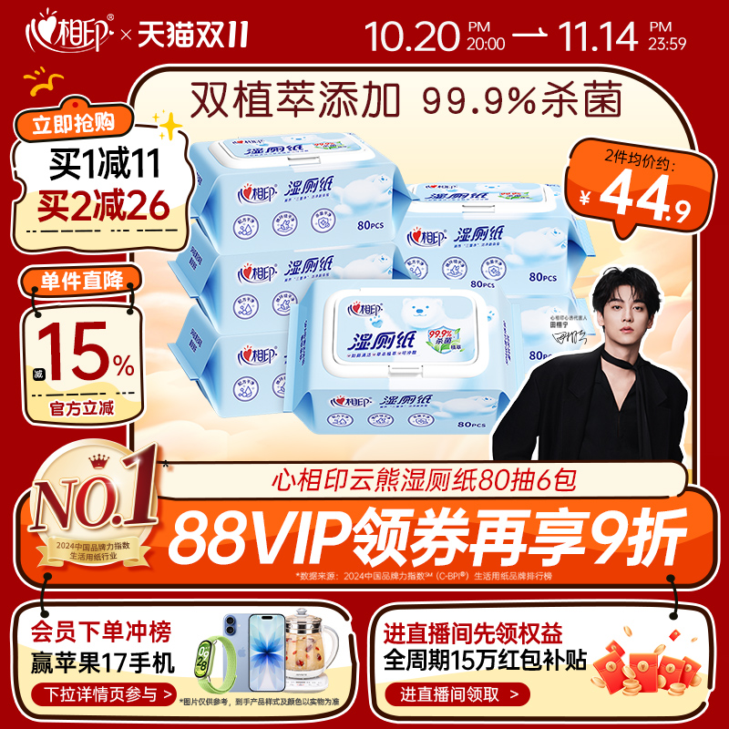 【田栩宁同款】心相印湿厕纸湿纸巾家庭湿厕巾擦屁屁杀菌清洁80抽