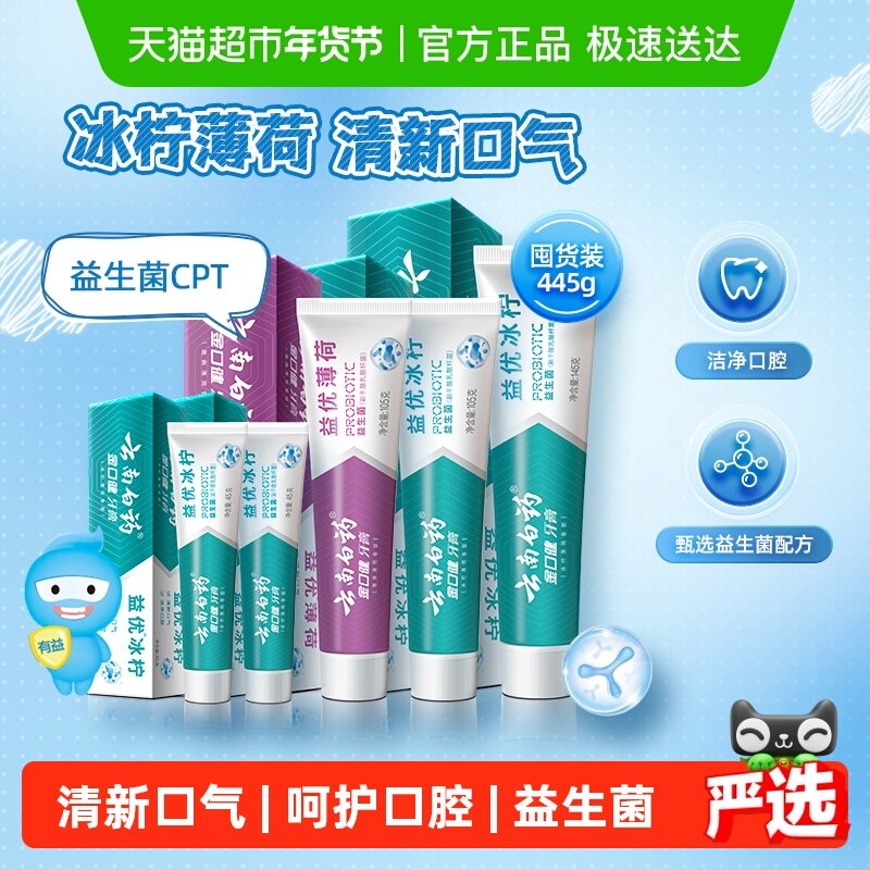 云南白药成人牙膏445g益生菌清新口气组合-下拉详情更优惠