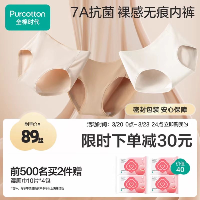全棉时代女士中腰三角裤纯棉裸感无痕隐形抗菌透气女款内裤3条