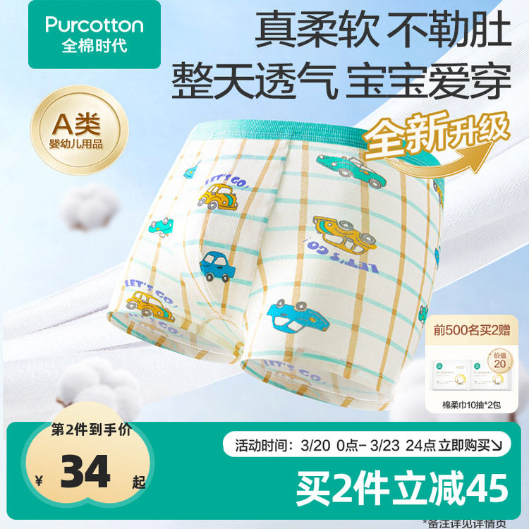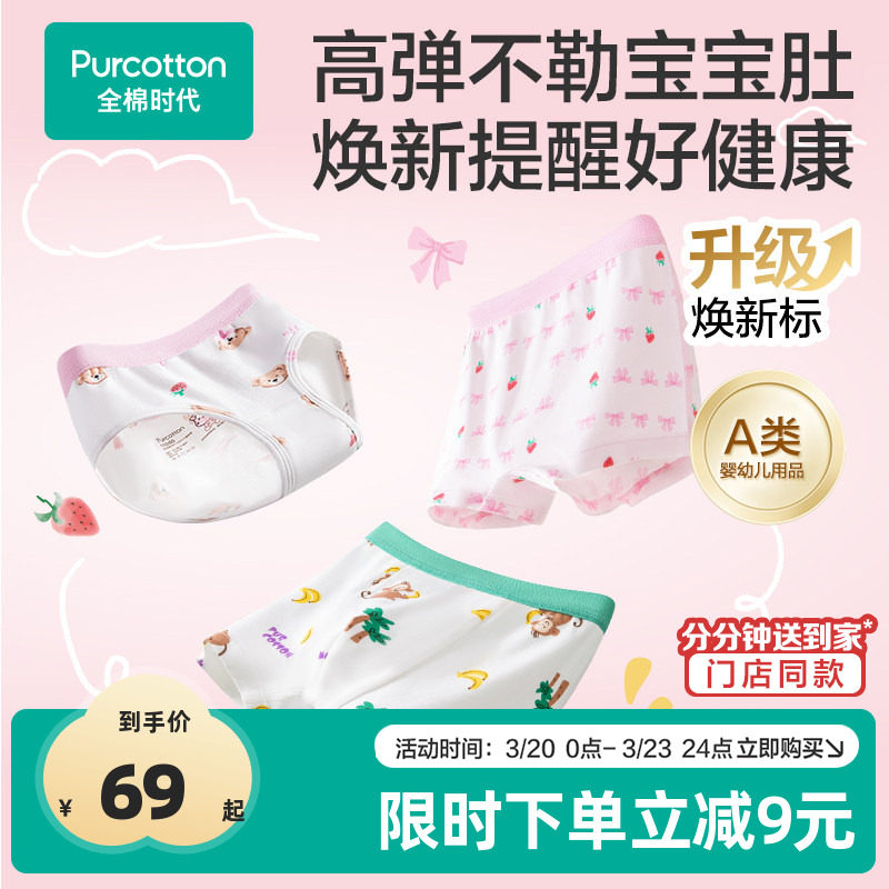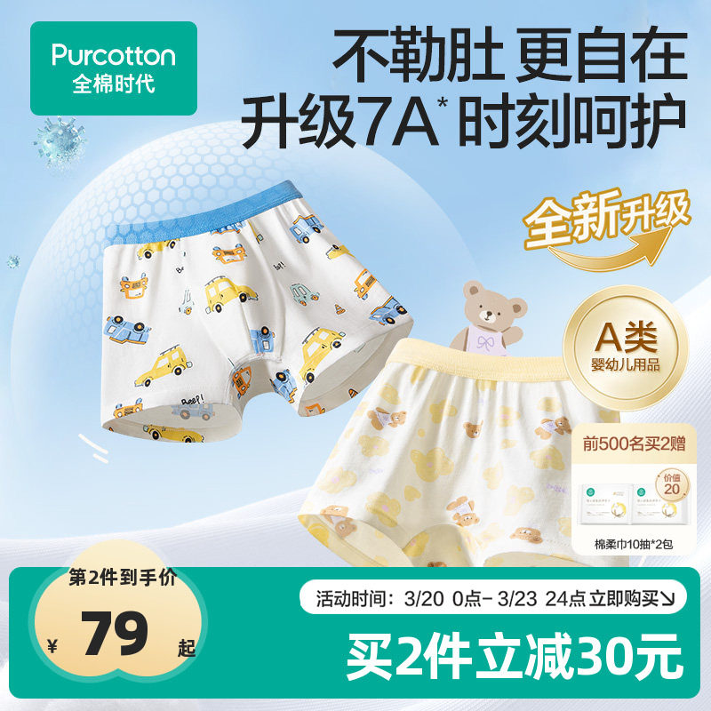 全棉时代年新款儿童7A抗菌内裤男女宝宝透气平角短裤3条装