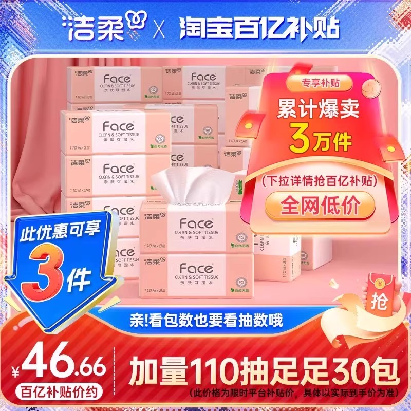洁柔纸巾可湿水抽纸面巾纸3层110抽餐巾纸30包擦手卫生纸实惠装