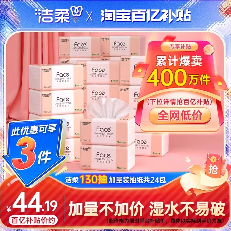 洁柔纸巾face抽纸130抽24包家用卫生纸整箱擦手面巾纸实惠餐巾纸
