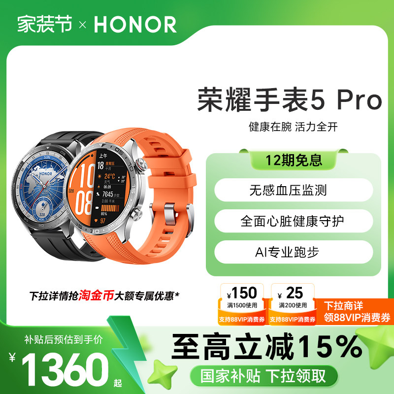 【政府补贴15%】HONOR/荣耀手表5 Pro 智能手表 支持全面心脏健康守护 无感血压监测 eSIM长续航运动手表