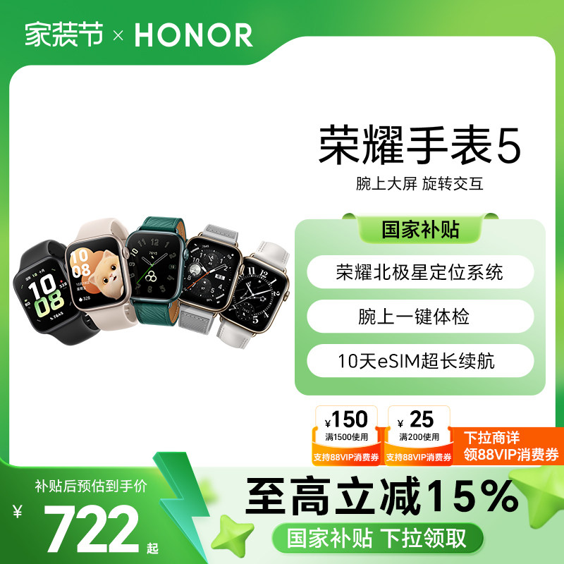 【政府补贴15%】荣耀手表5 智能运动手表 荣耀北极星定位 腕上一键体检 10天eSIM超长续航 手表